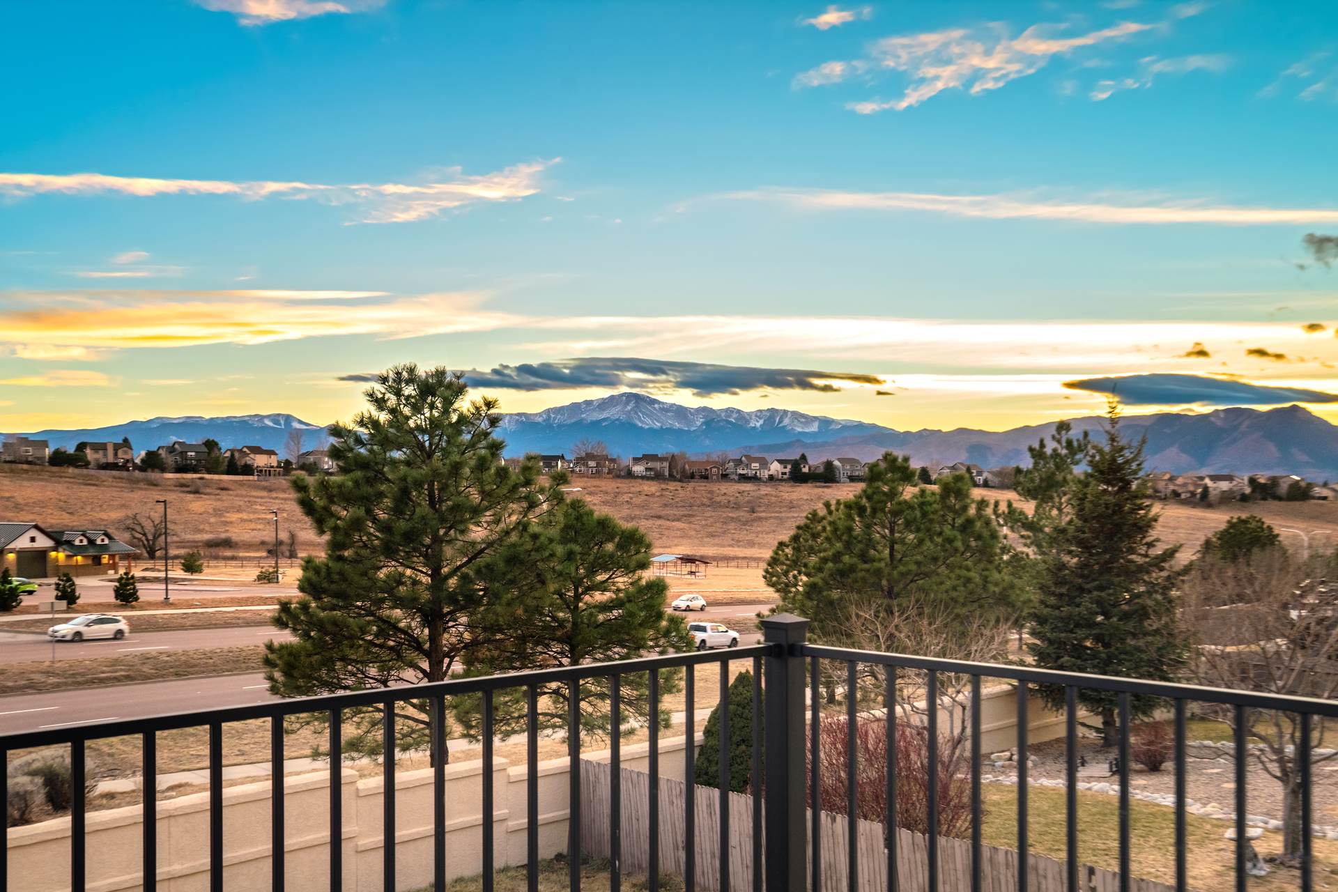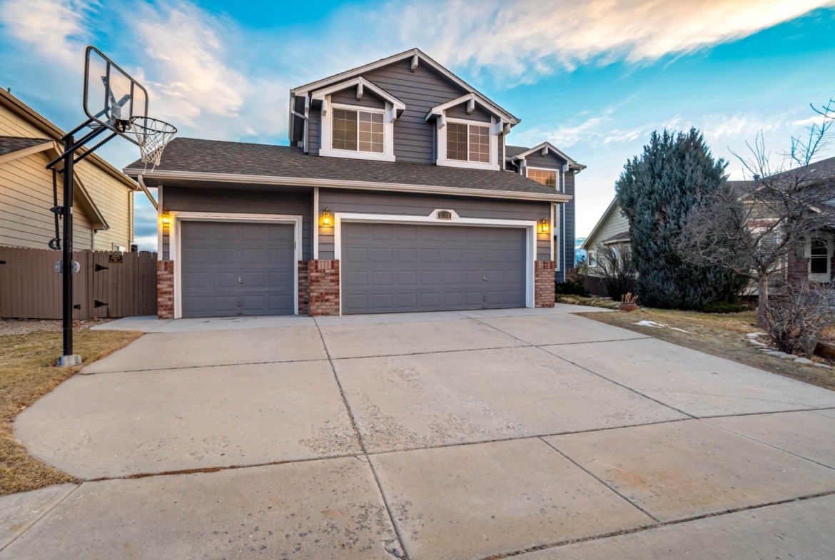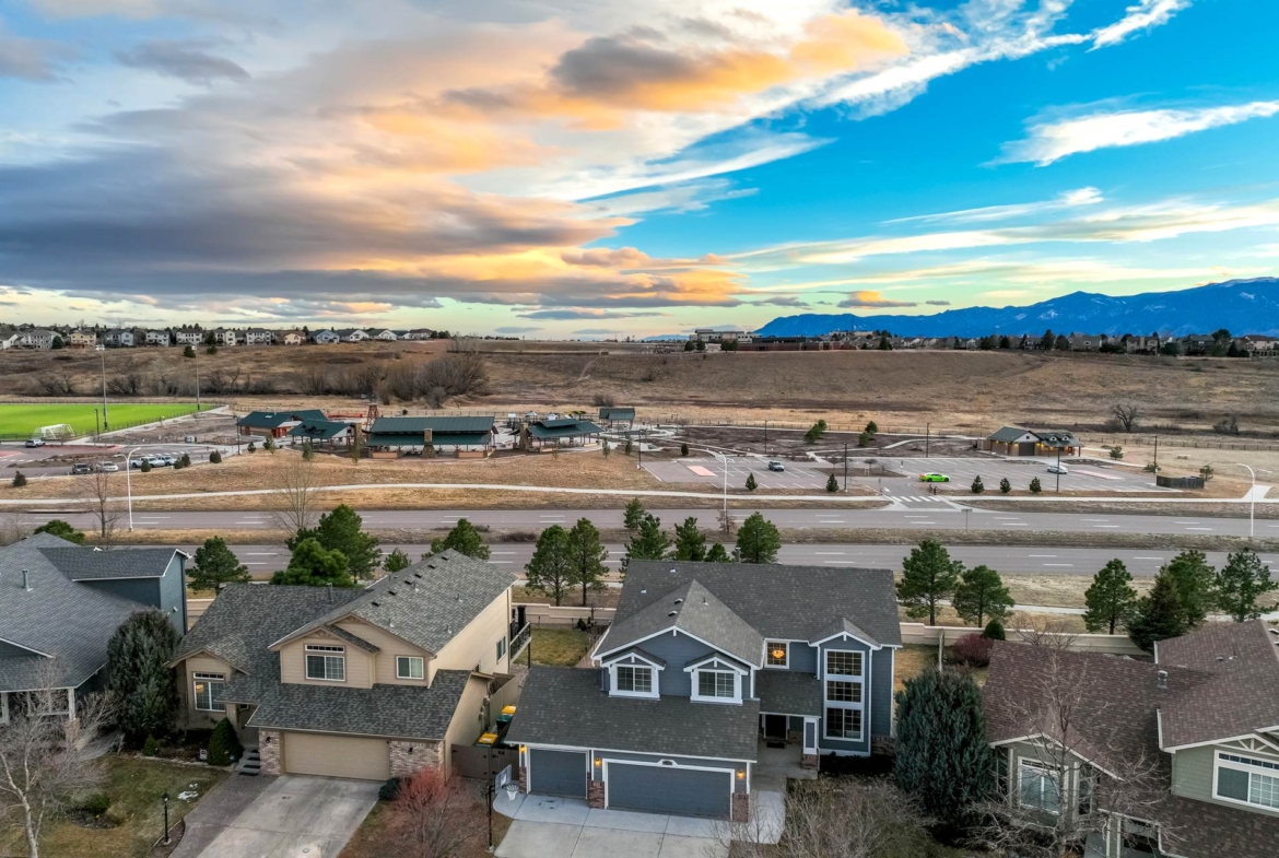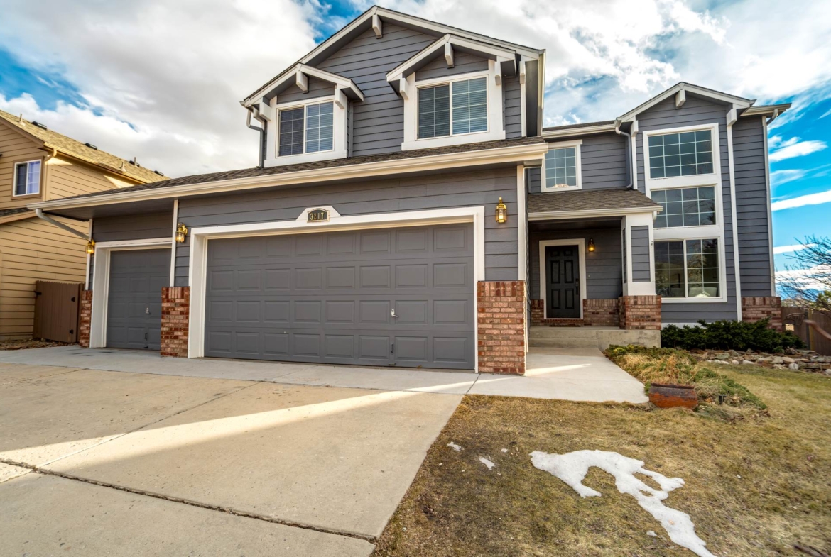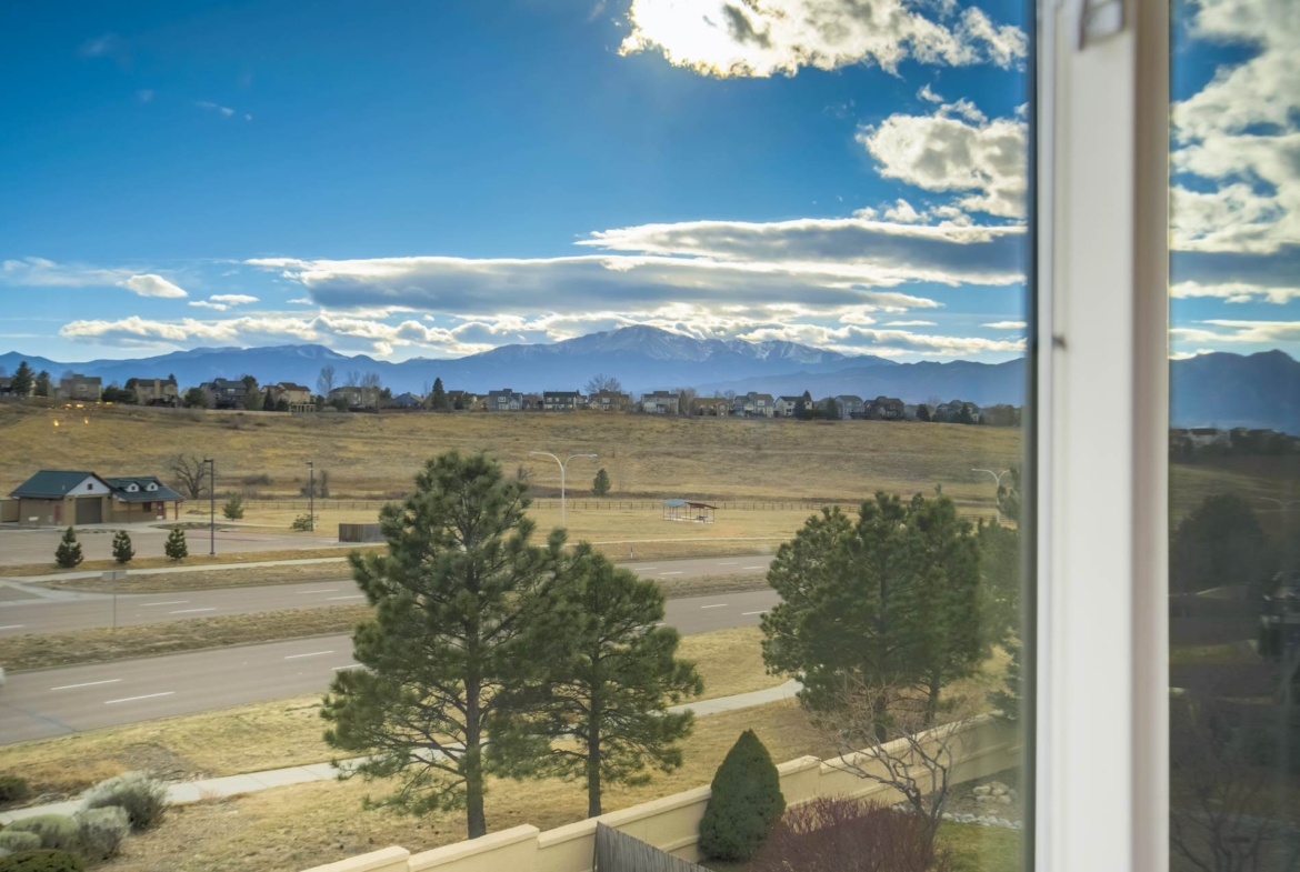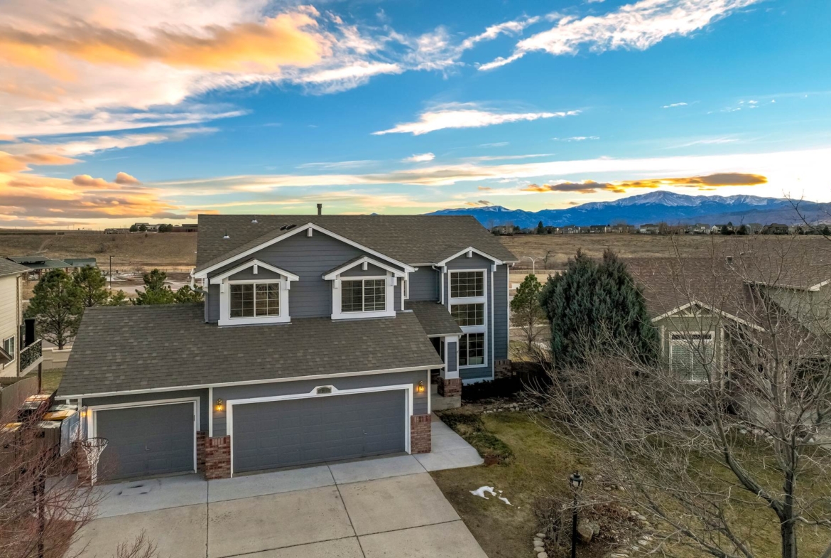 Beautiful open two-story home located at 3217 Sand Flower Dr, in Pine Creek featuring amazing mountain views of Pikes Peak and exceptional updates throughout. This inviting home showcases luxury plank flooring throughout the entire house and a completely renovated kitchen and primary bath with beautiful new granite countertops and modern finishes. The dramatic two-story vaulted ceiling in the living room creates an impressive sense of space and light. The fully updated kitchen offers a pantry, center island, pull-out drawers, and flows seamlessly into the comfortable family room with a cozy gas fireplace. A convenient main-level office with French doors provides the perfect work-from-home space. Upstairs, the spacious primary suite features a vaulted ceiling, charming window bench seating, and a completely new and renovated five-piece primary bath designed with style and comfort in mind. Additional highlights include three bay windows, central air conditioning, a three-car garage, and fresh exterior paint. Step outside to enjoy the brand-new deck where you can take in the spectacular, unobstructed views of Pikes Peak, plus a 10×10 concrete patio below. The large walk-out unfinished basement with bathroom rough-in offers endless potential for future expansion and includes built-in shelving and cabinets for extra storage. The backyard features partial concrete fencing and dedicated garden beds ideal for vegetables or flowers. Located directly across from John Venezia Park, residents enjoy easy access to covered pavilions, expansive sports fields, playground equipment, and a seasonal splash park. The home is also conveniently located near UCHealth Memorial Hospital North, major commuting routes, and a wide variety of shopping and dining options.