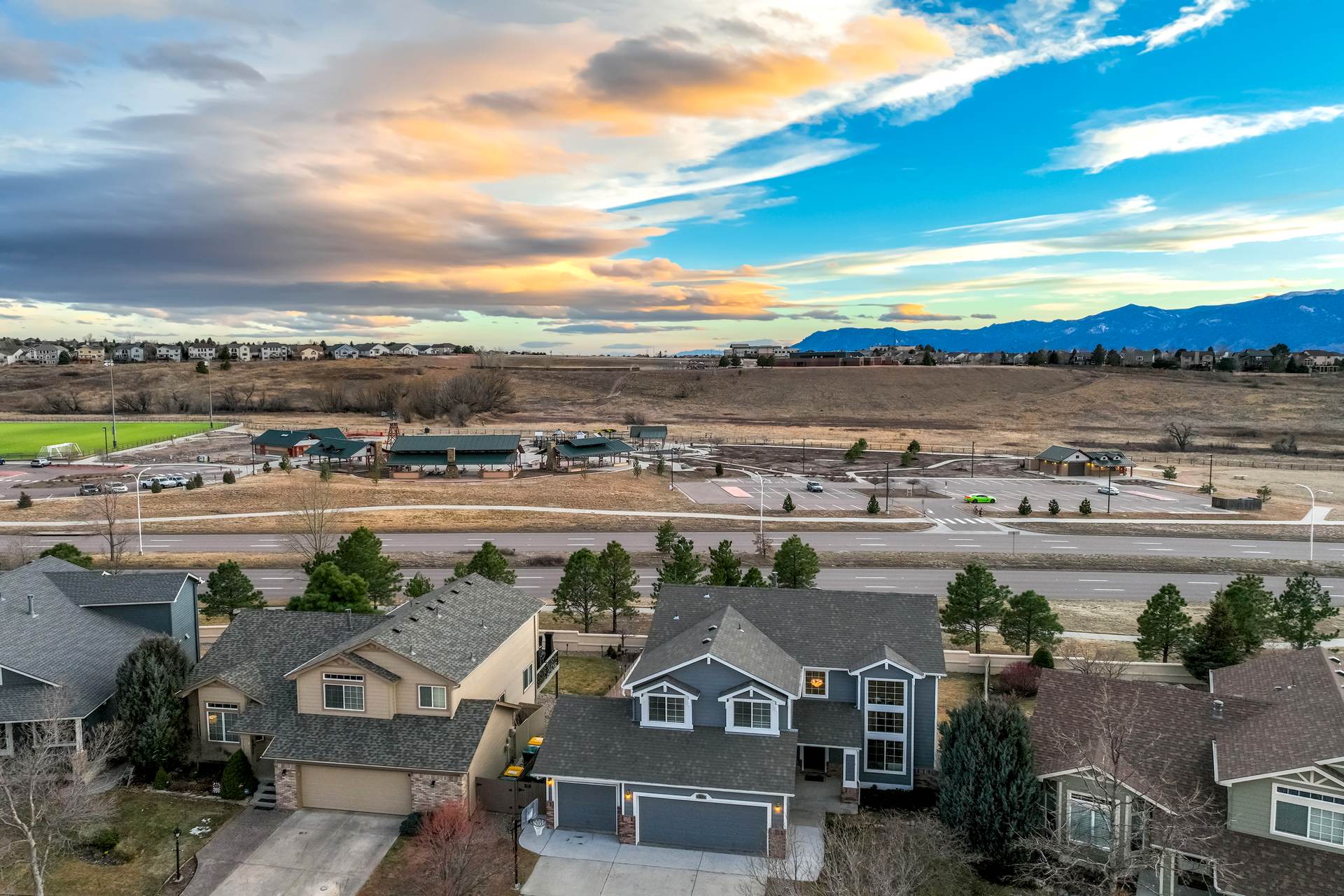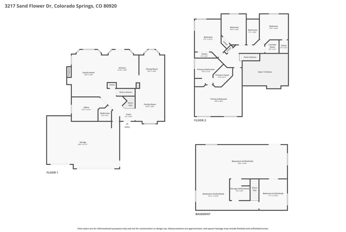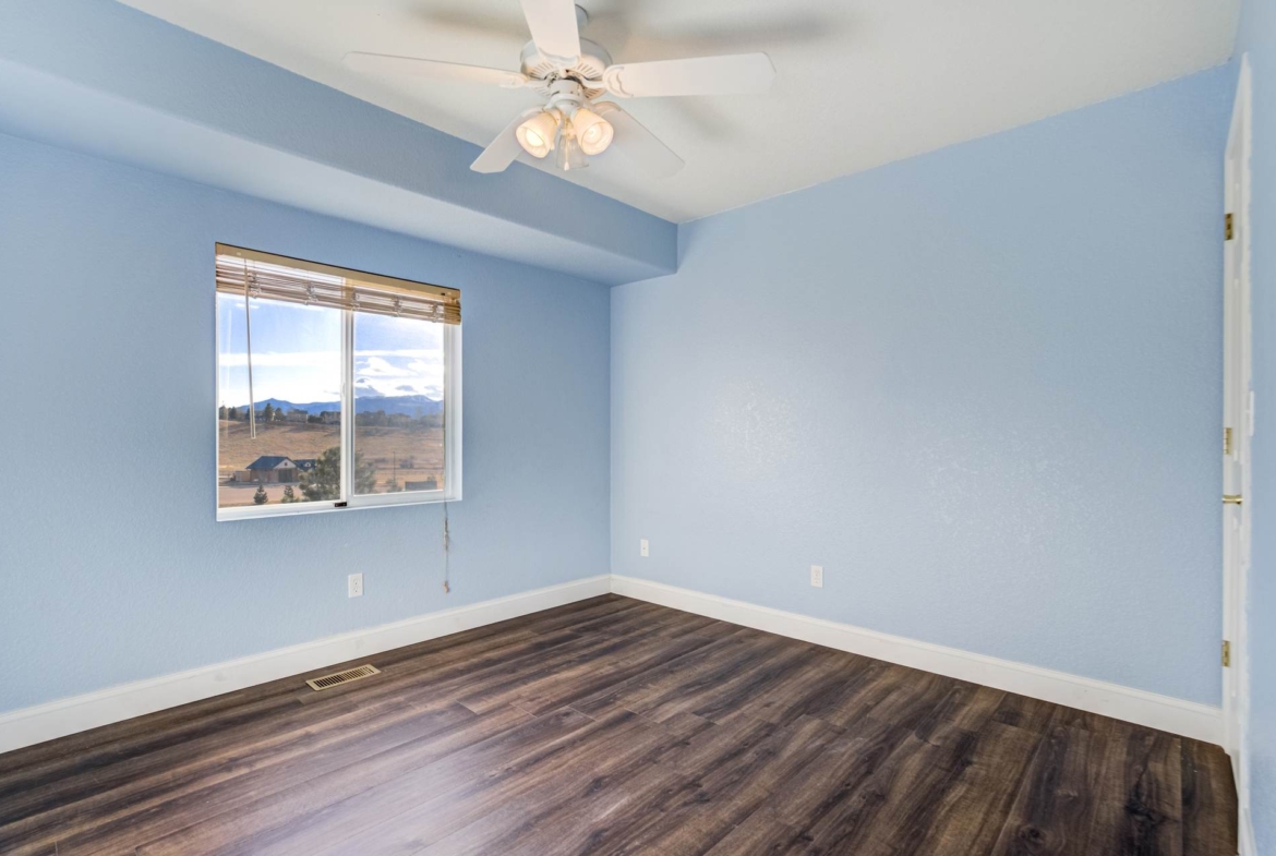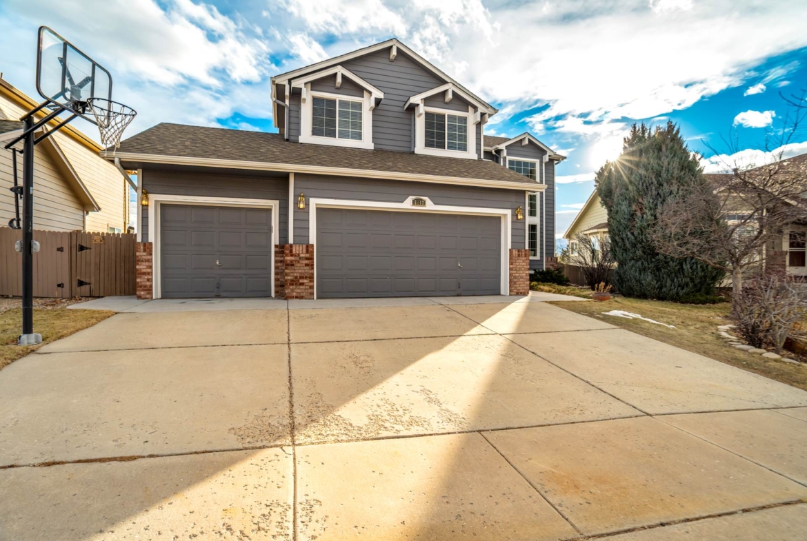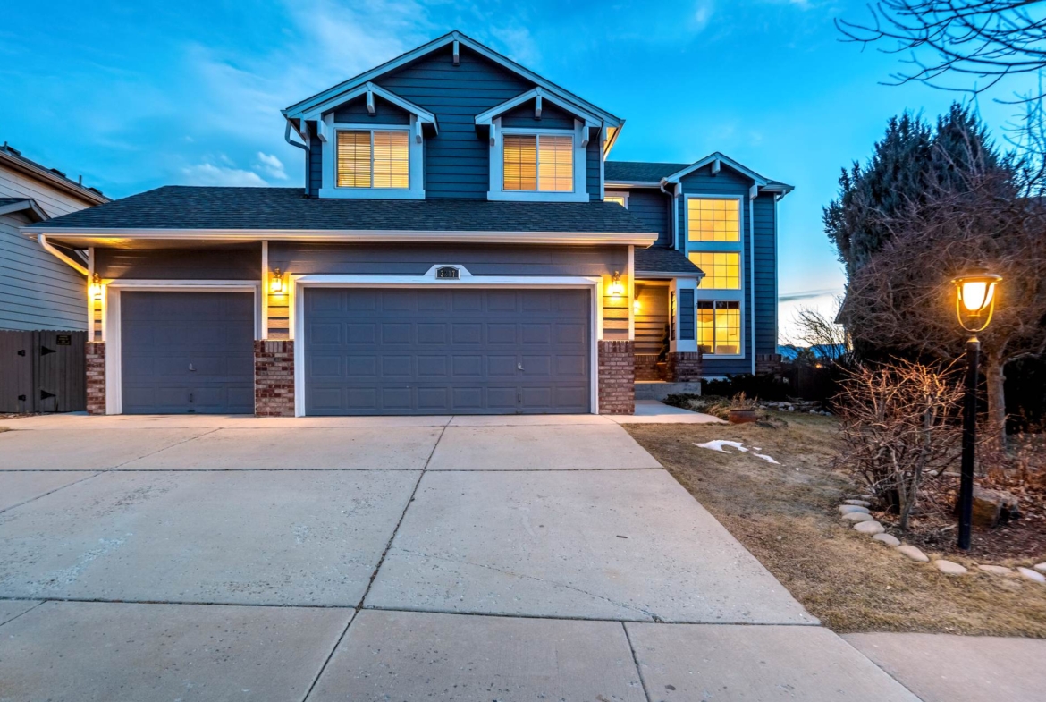 Beautiful open two-story home located at 3217 Sand Flower Dr, in Pine Creek featuring amazing mountain views of Pikes Peak and exceptional updates throughout. This inviting home showcases luxury plank flooring throughout the entire house and a completely renovated kitchen and primary bath with beautiful new granite countertops and modern finishes. The dramatic two-story vaulted ceiling in the living room creates an impressive sense of space and light. The fully updated kitchen offers a pantry, center island, pull-out drawers, and flows seamlessly into the comfortable family room with a cozy gas fireplace. A convenient main-level office with French doors provides the perfect work-from-home space. Upstairs, the spacious primary suite features a vaulted ceiling, charming window bench seating, and a completely new and renovated five-piece primary bath designed with style and comfort in mind. Additional highlights include three bay windows, central air conditioning, a three-car garage, and fresh exterior paint. Step outside to enjoy the brand-new deck where you can take in the spectacular, unobstructed views of Pikes Peak, plus a 10×10 concrete patio below. The large walk-out unfinished basement with bathroom rough-in offers endless potential for future expansion and includes built-in shelving and cabinets for extra storage. The backyard features partial concrete fencing and dedicated garden beds ideal for vegetables or flowers. Located directly across from John Venezia Park, residents enjoy easy access to covered pavilions, expansive sports fields, playground equipment, and a seasonal splash park. The home is also conveniently located near UCHealth Memorial Hospital North, major commuting routes, and a wide variety of shopping and dining options.