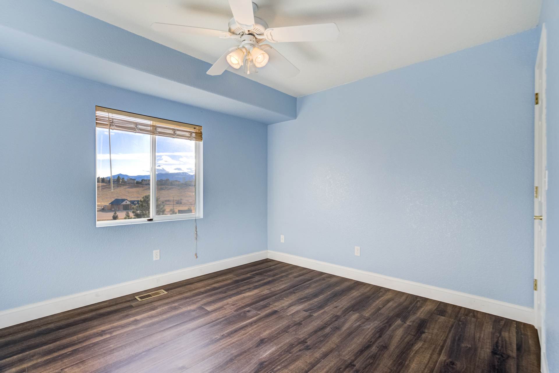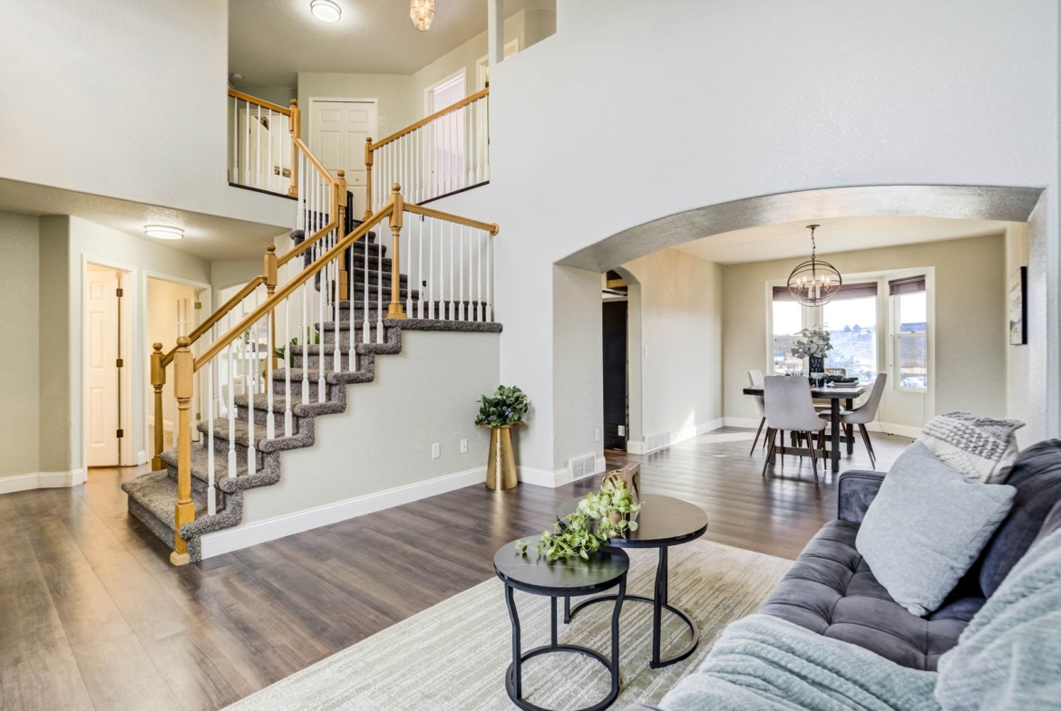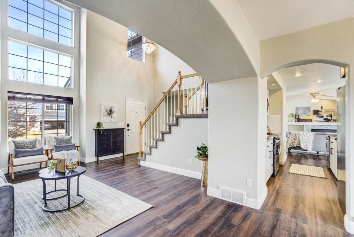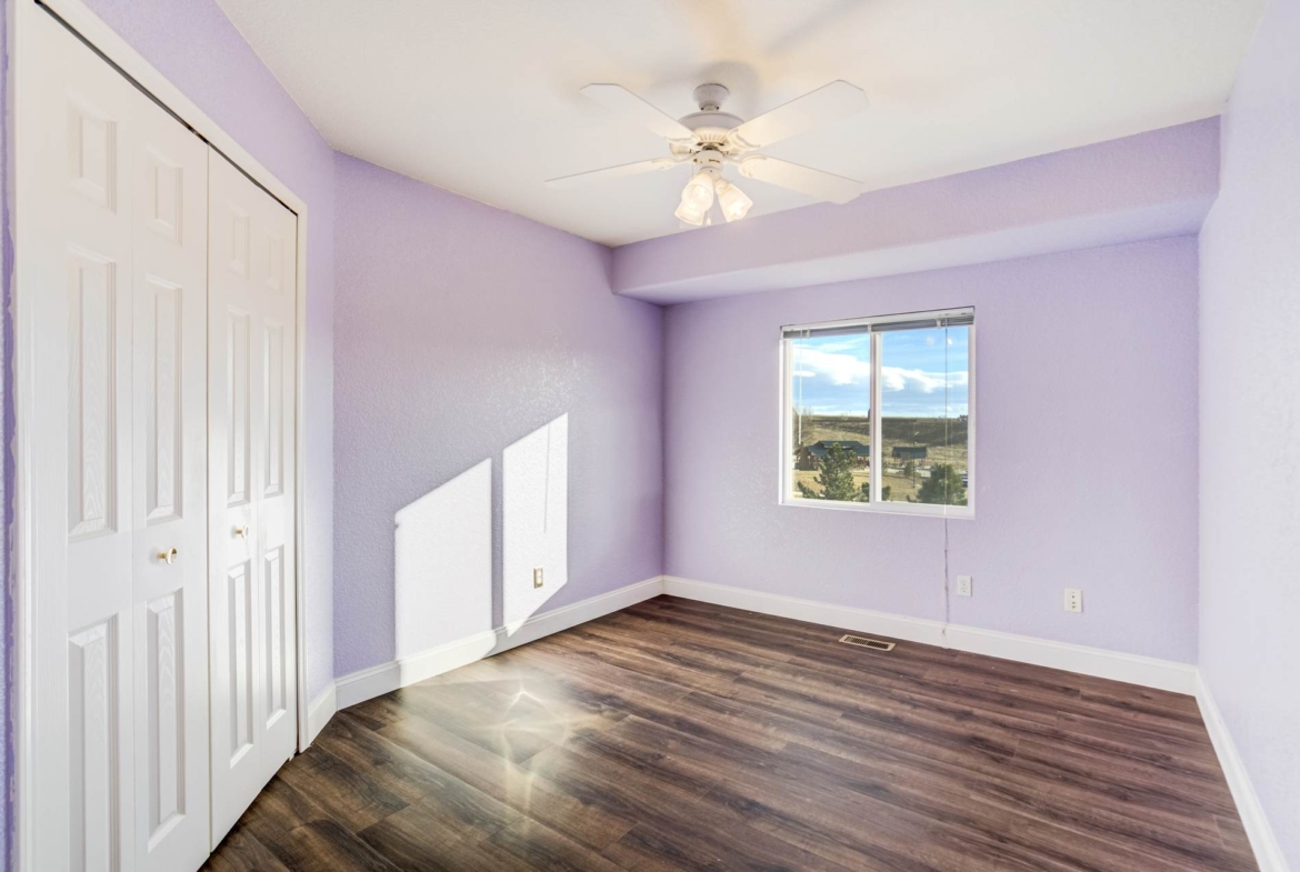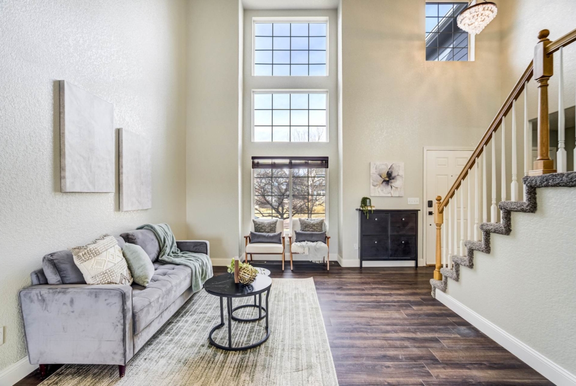 Beautiful open two-story home located at 3217 Sand Flower Dr, in Pine Creek featuring amazing mountain views of Pikes Peak and exceptional updates throughout. This inviting home showcases luxury plank flooring throughout the entire house and a completely renovated kitchen and primary bath with beautiful new granite countertops and modern finishes. The dramatic two-story vaulted ceiling in the living room creates an impressive sense of space and light. The fully updated kitchen offers a pantry, center island, pull-out drawers, and flows seamlessly into the comfortable family room with a cozy gas fireplace. A convenient main-level office with French doors provides the perfect work-from-home space. Upstairs, the spacious primary suite features a vaulted ceiling, charming window bench seating, and a completely new and renovated five-piece primary bath designed with style and comfort in mind. Additional highlights include three bay windows, central air conditioning, a three-car garage, and fresh exterior paint. Step outside to enjoy the brand-new deck where you can take in the spectacular, unobstructed views of Pikes Peak, plus a 10×10 concrete patio below. The large walk-out unfinished basement with bathroom rough-in offers endless potential for future expansion and includes built-in shelving and cabinets for extra storage. The backyard features partial concrete fencing and dedicated garden beds ideal for vegetables or flowers. Located directly across from John Venezia Park, residents enjoy easy access to covered pavilions, expansive sports fields, playground equipment, and a seasonal splash park. The home is also conveniently located near UCHealth Memorial Hospital North, major commuting routes, and a wide variety of shopping and dining options.