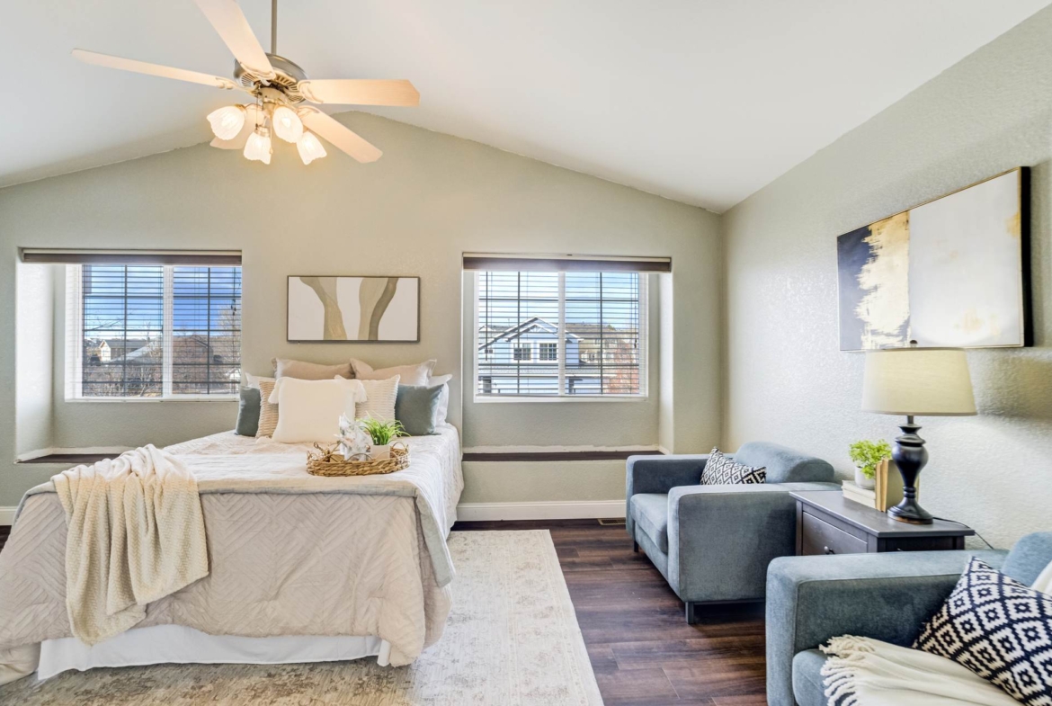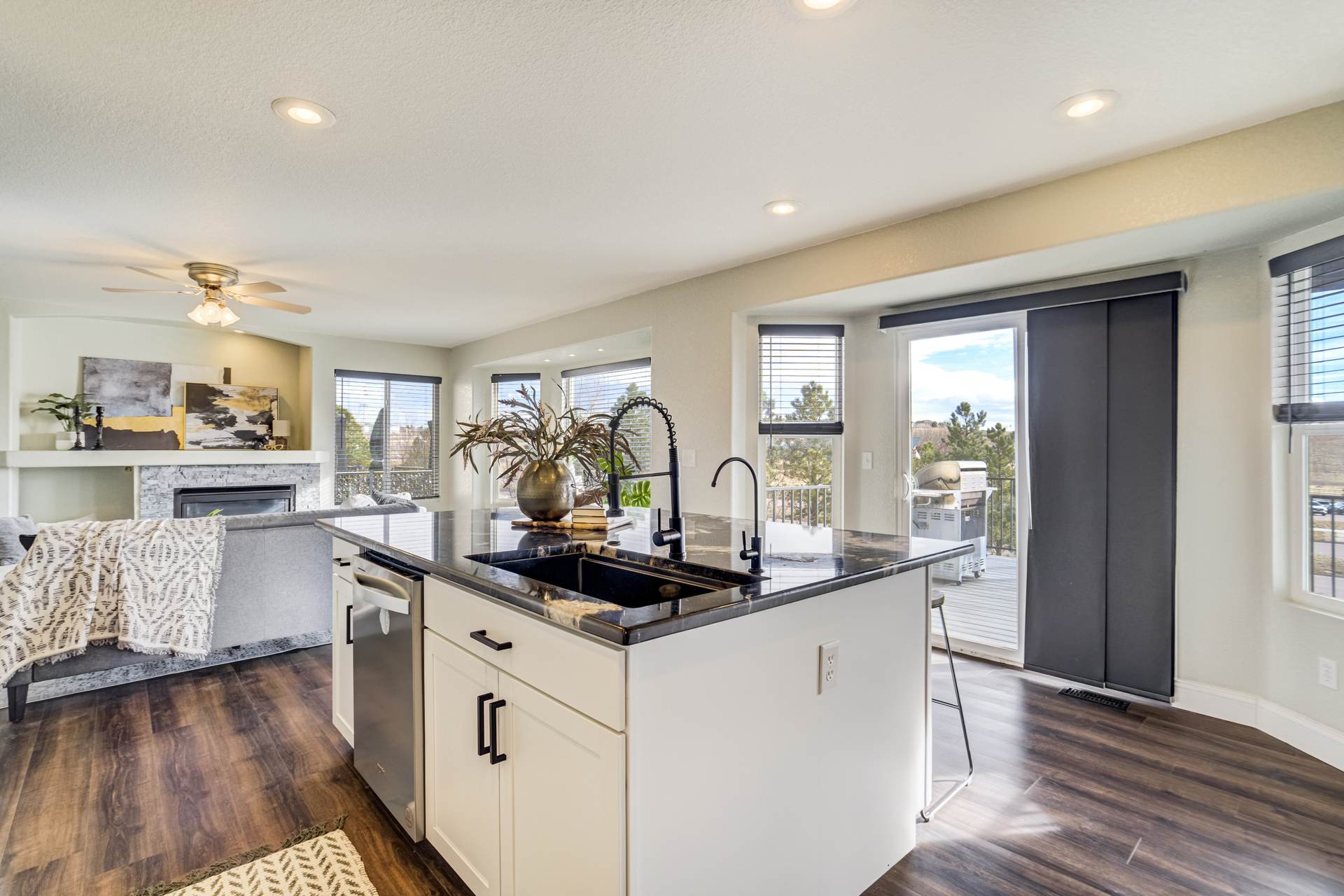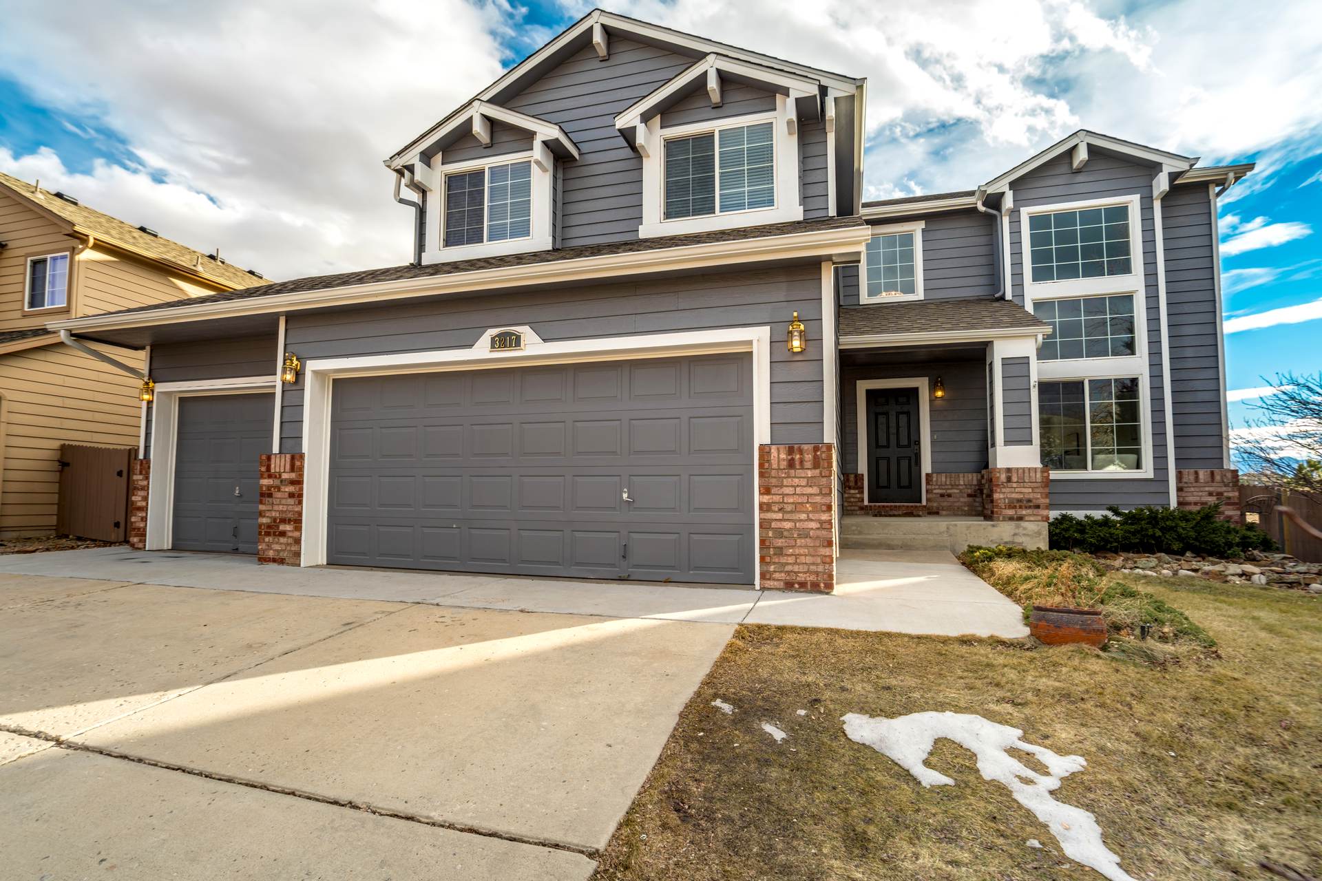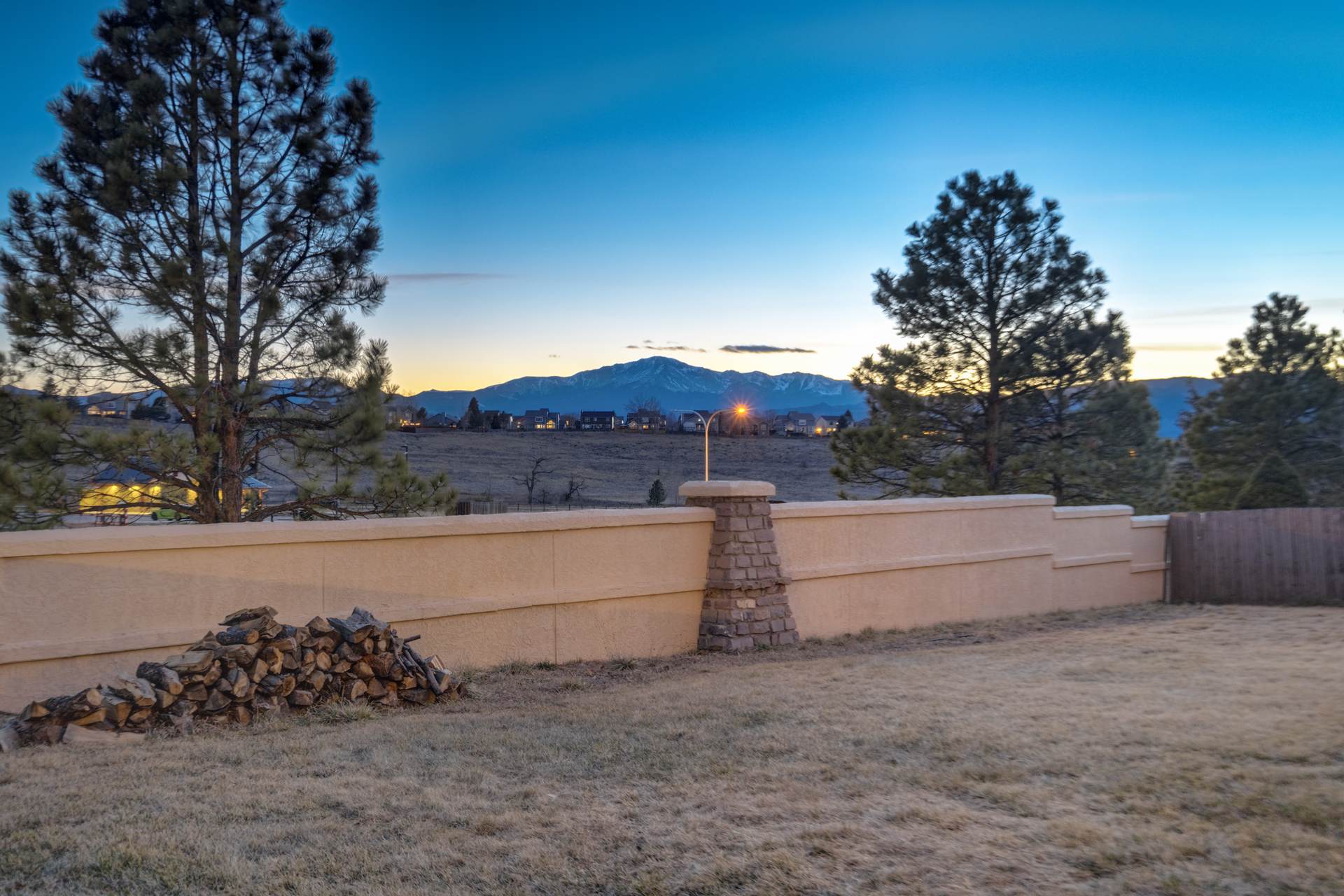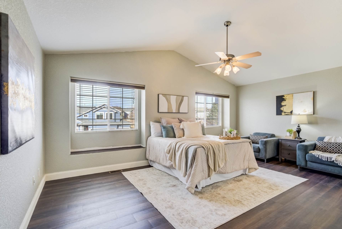 Beautiful open two-story home located at 3217 Sand Flower Dr, in Pine Creek featuring amazing mountain views of Pikes Peak and exceptional updates throughout. This inviting home showcases luxury plank flooring throughout the entire house and a completely renovated kitchen and primary bath with beautiful new granite countertops and modern finishes. The dramatic two-story vaulted ceiling in the living room creates an impressive sense of space and light. The fully updated kitchen offers a pantry, center island, pull-out drawers, and flows seamlessly into the comfortable family room with a cozy gas fireplace. A convenient main-level office with French doors provides the perfect work-from-home space. Upstairs, the spacious primary suite features a vaulted ceiling, charming window bench seating, and a completely new and renovated five-piece primary bath designed with style and comfort in mind. Additional highlights include three bay windows, central air conditioning, a three-car garage, and fresh exterior paint. Step outside to enjoy the brand-new deck where you can take in the spectacular, unobstructed views of Pikes Peak, plus a 10×10 concrete patio below. The large walk-out unfinished basement with bathroom rough-in offers endless potential for future expansion and includes built-in shelving and cabinets for extra storage. The backyard features partial concrete fencing and dedicated garden beds ideal for vegetables or flowers. Located directly across from John Venezia Park, residents enjoy easy access to covered pavilions, expansive sports fields, playground equipment, and a seasonal splash park. The home is also conveniently located near UCHealth Memorial Hospital North, major commuting routes, and a wide variety of shopping and dining options.