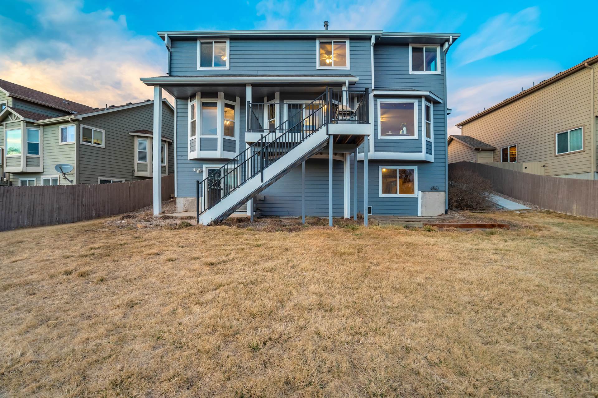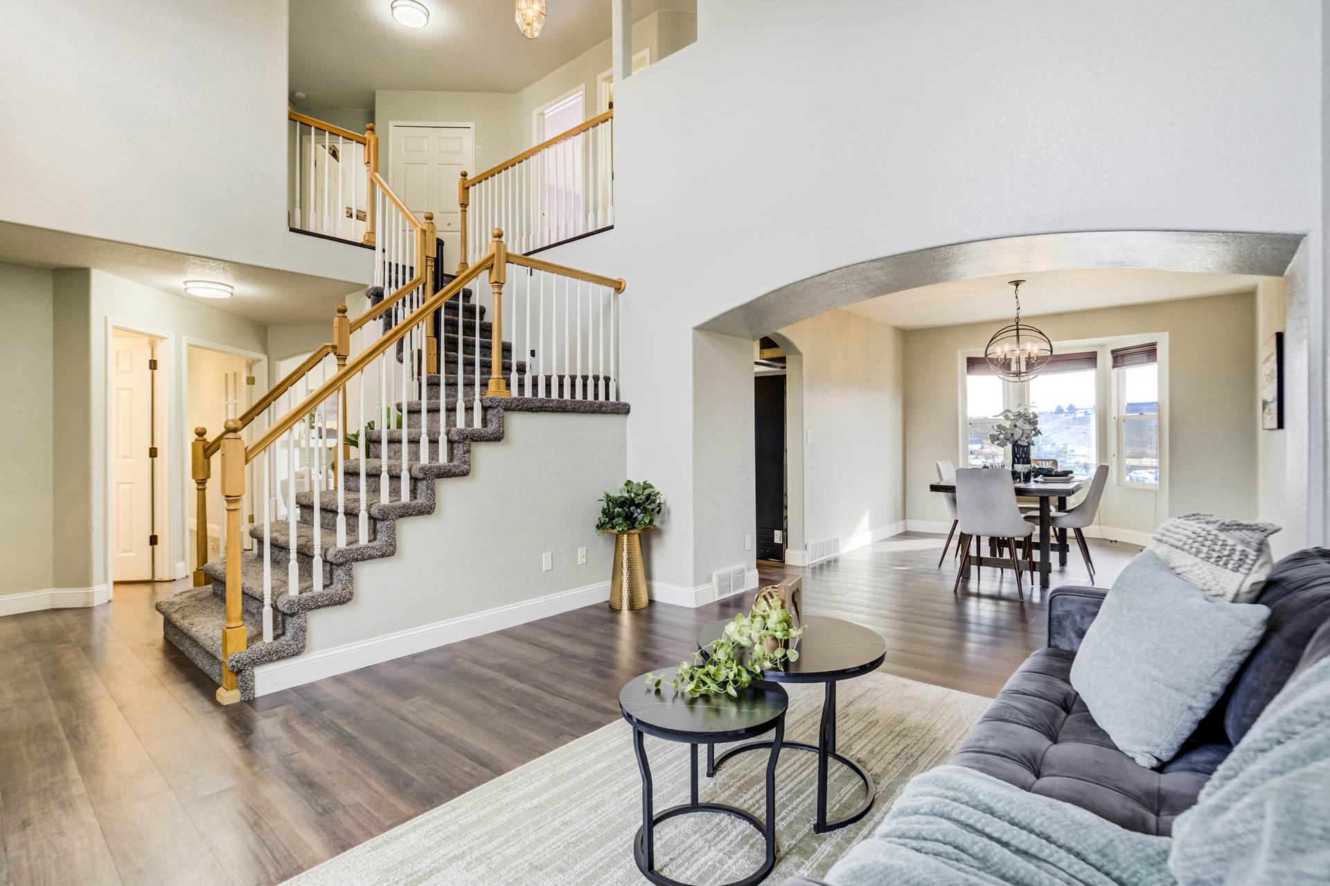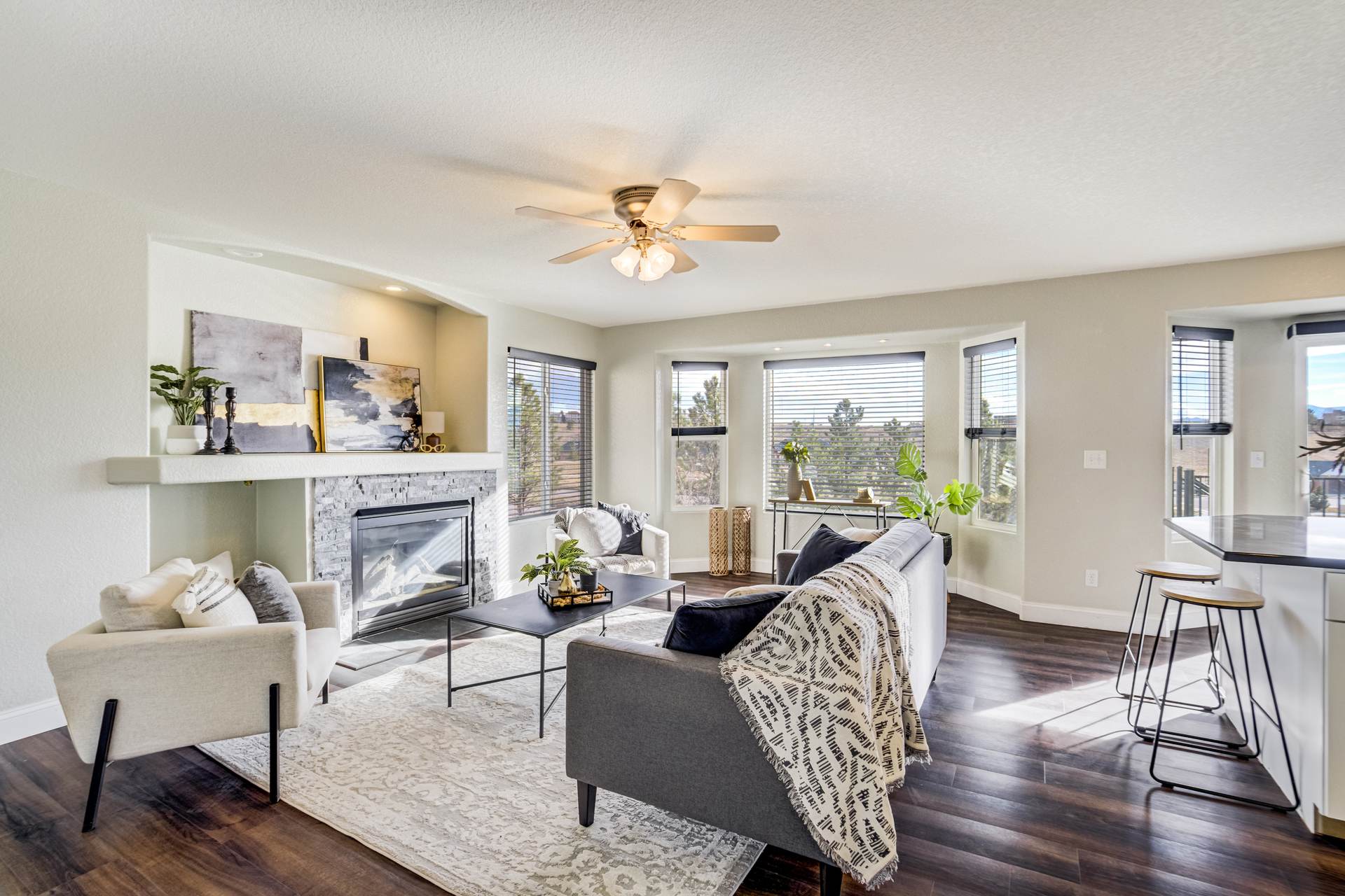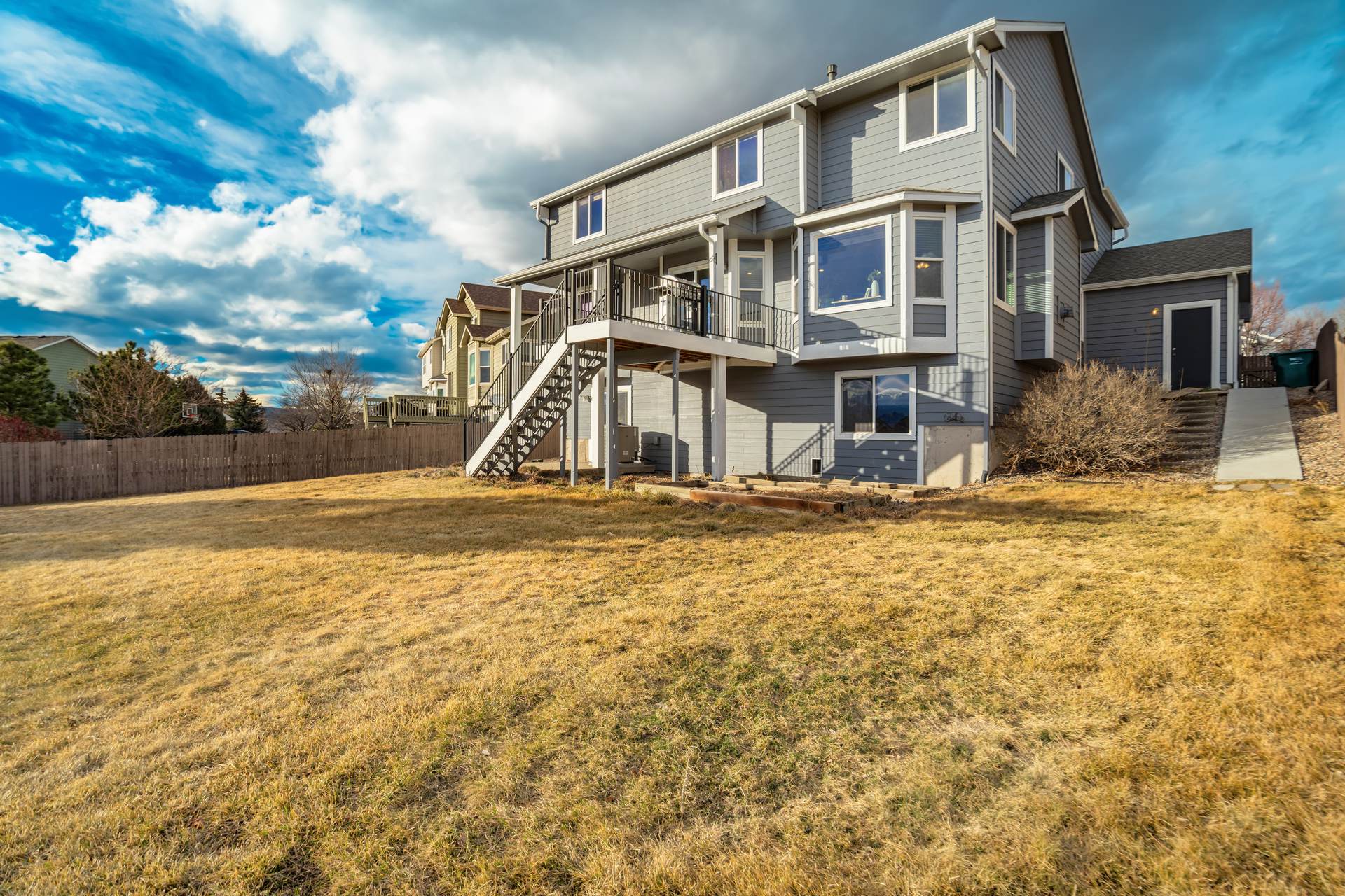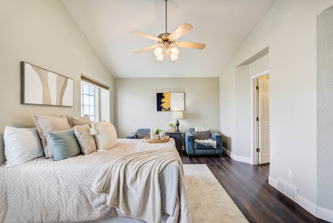 Beautiful open two-story home located at 3217 Sand Flower Dr, in Pine Creek featuring amazing mountain views of Pikes Peak and exceptional updates throughout. This inviting home showcases luxury plank flooring throughout the entire house and a completely renovated kitchen and primary bath with beautiful new granite countertops and modern finishes. The dramatic two-story vaulted ceiling in the living room creates an impressive sense of space and light. The fully updated kitchen offers a pantry, center island, pull-out drawers, and flows seamlessly into the comfortable family room with a cozy gas fireplace. A convenient main-level office with French doors provides the perfect work-from-home space. Upstairs, the spacious primary suite features a vaulted ceiling, charming window bench seating, and a completely new and renovated five-piece primary bath designed with style and comfort in mind. Additional highlights include three bay windows, central air conditioning, a three-car garage, and fresh exterior paint. Step outside to enjoy the brand-new deck where you can take in the spectacular, unobstructed views of Pikes Peak, plus a 10×10 concrete patio below. The large walk-out unfinished basement with bathroom rough-in offers endless potential for future expansion and includes built-in shelving and cabinets for extra storage. The backyard features partial concrete fencing and dedicated garden beds ideal for vegetables or flowers. Located directly across from John Venezia Park, residents enjoy easy access to covered pavilions, expansive sports fields, playground equipment, and a seasonal splash park. The home is also conveniently located near UCHealth Memorial Hospital North, major commuting routes, and a wide variety of shopping and dining options.