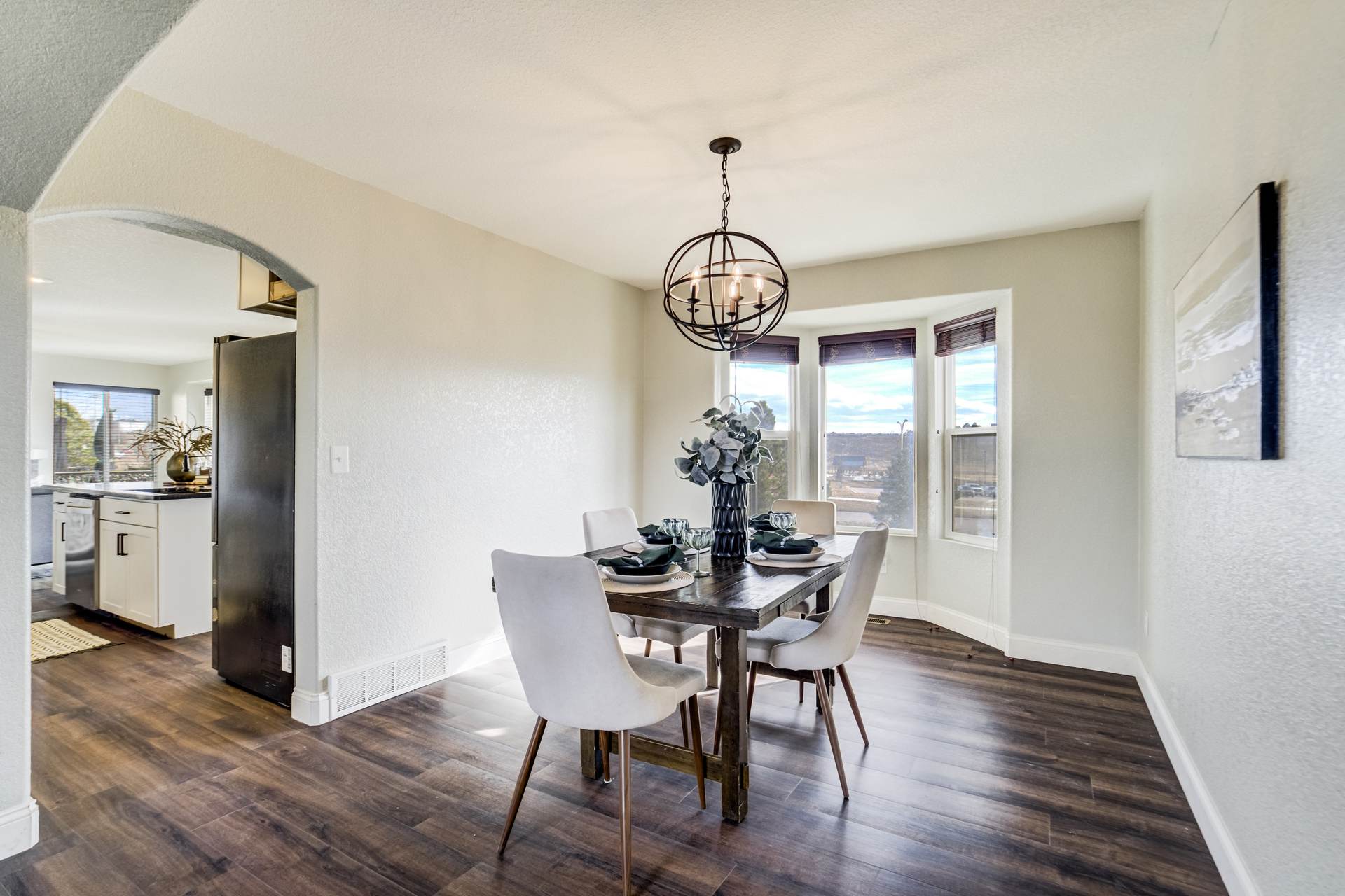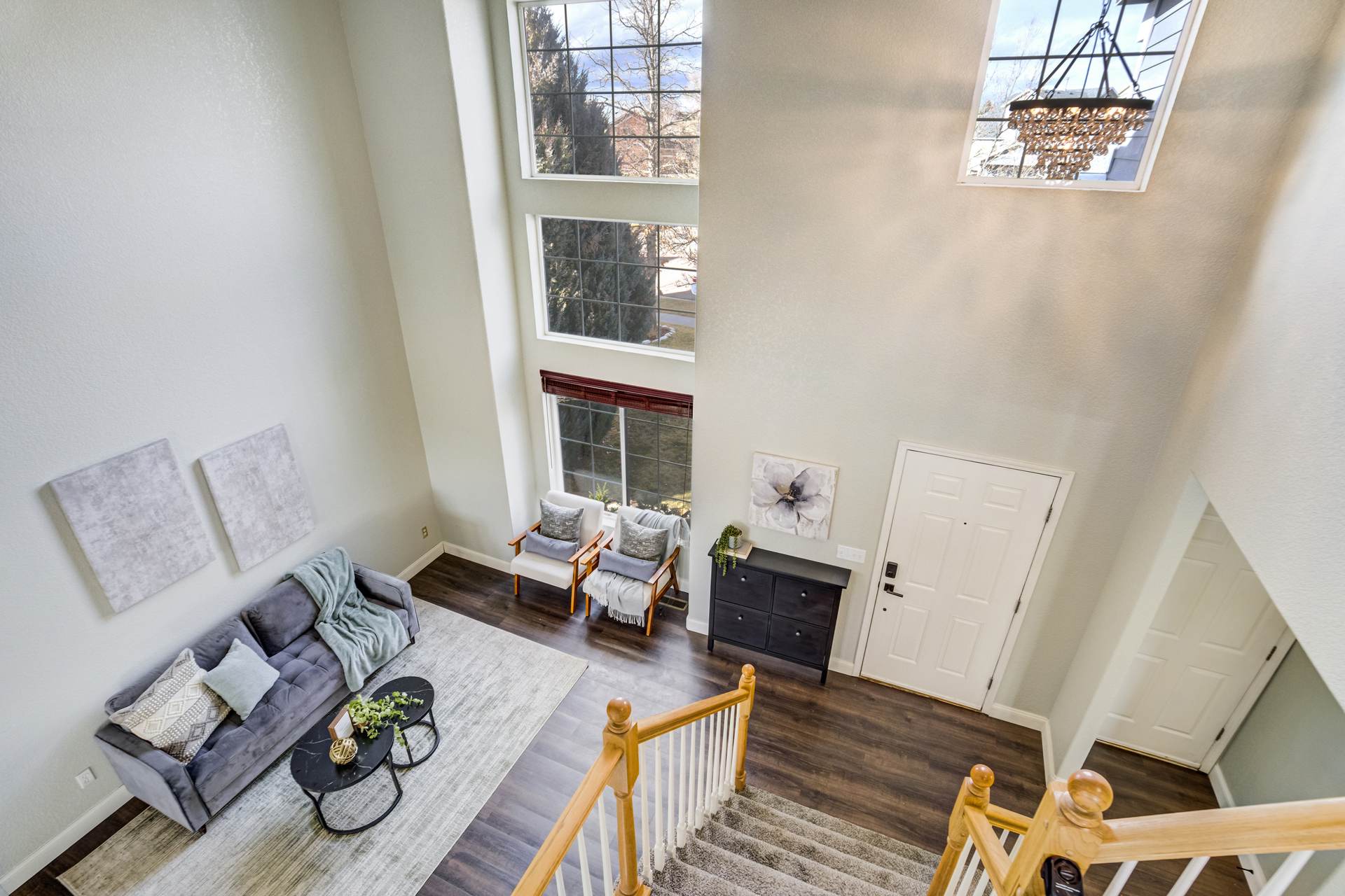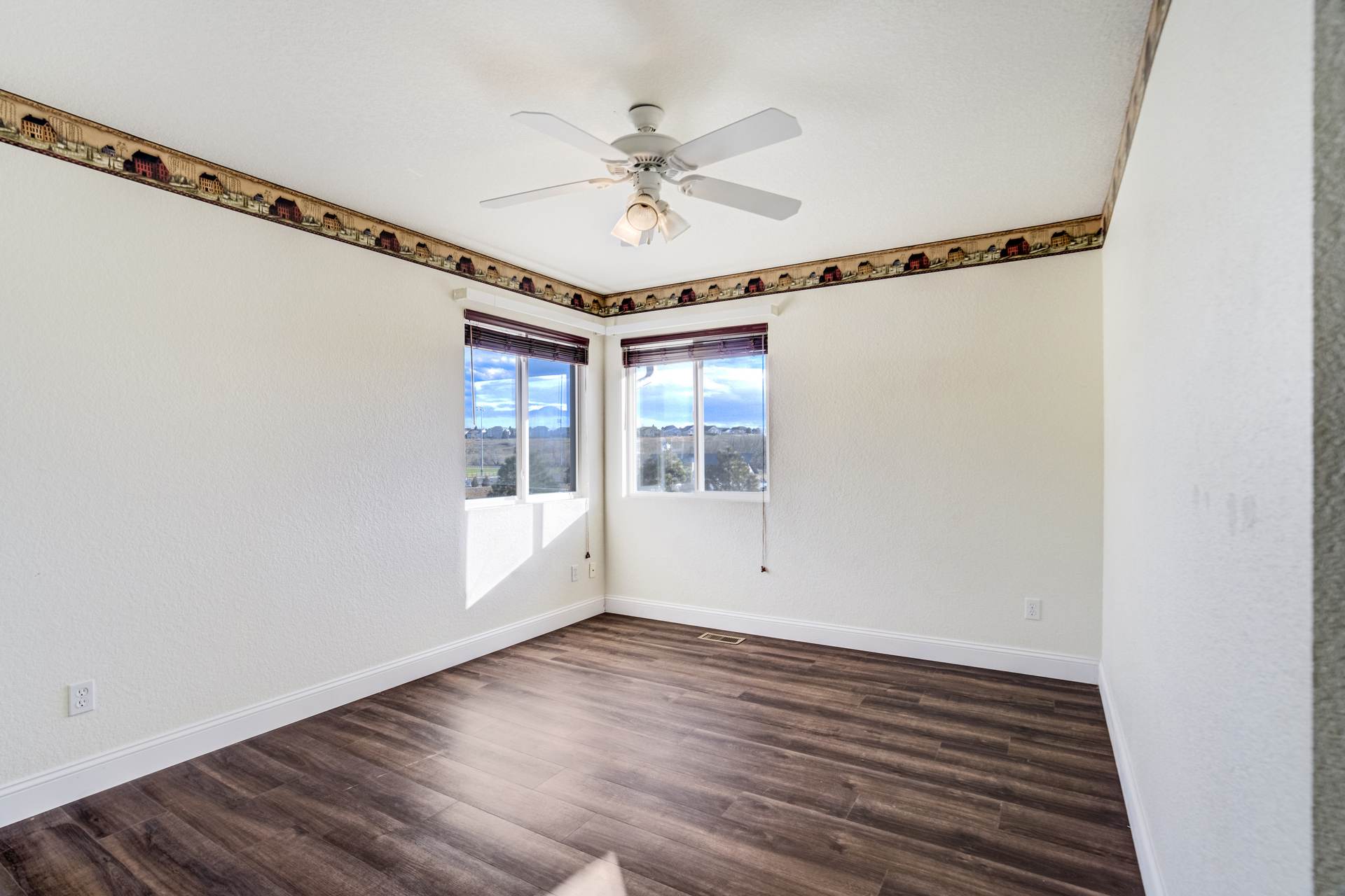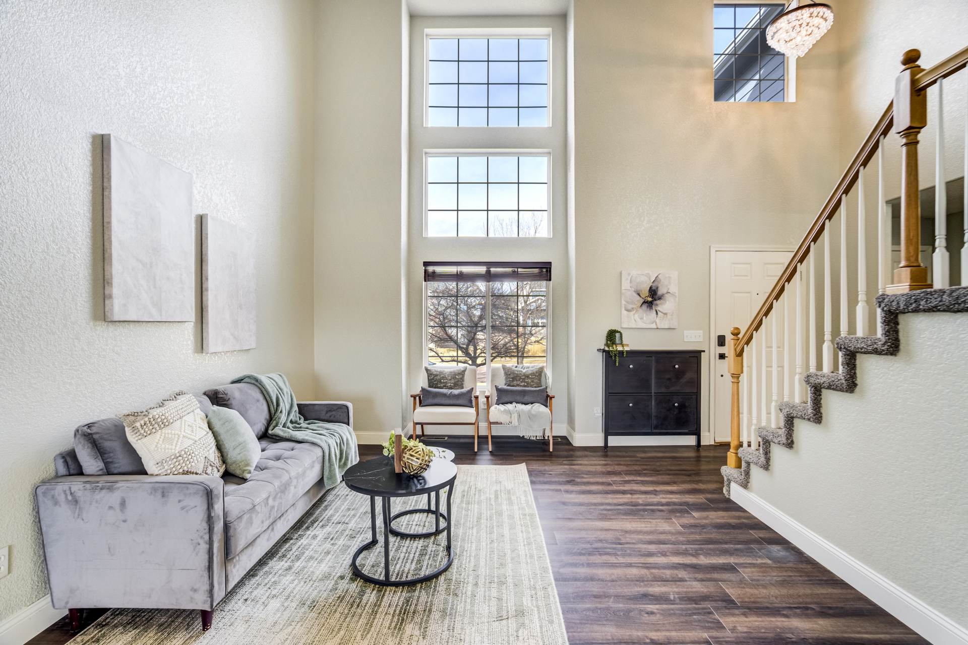 Beautiful open two-story home located at 3217 Sand Flower Dr, in Pine Creek featuring amazing mountain views of Pikes Peak and exceptional updates throughout. This inviting home showcases luxury plank flooring throughout the entire house and a completely renovated kitchen and primary bath with beautiful new granite countertops and modern finishes. The dramatic two-story vaulted ceiling in the living room creates an impressive sense of space and light. The fully updated kitchen offers a pantry, center island, pull-out drawers, and flows seamlessly into the comfortable family room with a cozy gas fireplace. A convenient main-level office with French doors provides the perfect work-from-home space. Upstairs, the spacious primary suite features a vaulted ceiling, charming window bench seating, and a completely new and renovated five-piece primary bath designed with style and comfort in mind. Additional highlights include three bay windows, central air conditioning, a three-car garage, and fresh exterior paint. Step outside to enjoy the brand-new deck where you can take in the spectacular, unobstructed views of Pikes Peak, plus a 10×10 concrete patio below. The large walk-out unfinished basement with bathroom rough-in offers endless potential for future expansion and includes built-in shelving and cabinets for extra storage. The backyard features partial concrete fencing and dedicated garden beds ideal for vegetables or flowers. Located directly across from John Venezia Park, residents enjoy easy access to covered pavilions, expansive sports fields, playground equipment, and a seasonal splash park. The home is also conveniently located near UCHealth Memorial Hospital North, major commuting routes, and a wide variety of shopping and dining options.